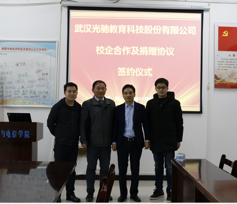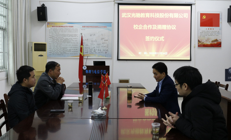11月24日,武汉光驰教育科技股份有限公司与我校签订实习实训基地建设协议书及捐赠仪式在物电楼205会议室举行,该公司总经理李小红出席了此次活动。