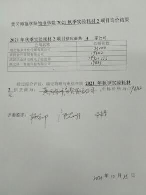 伟德victor1946物电学院2021年秋季实验耗材的采购招标工作从2021年10月14日启动,公开面向社会招标,并在学院网上公示,截止到10月23日共收到有效标书4份,于10月25日学院组织人员开标,开标结果为 :黄冈金开商贸有限公司以人民币19682元的价格中标。