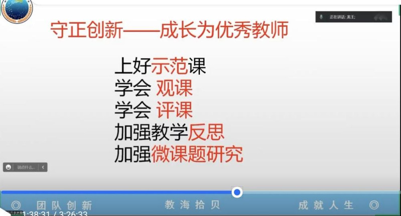 王性宇强调,守正创新才能成为一名优秀教师。他认为要成为优秀教师要做好五件事:一是要上好示范课;二是要学会观课;三是要学会评课;四是要加强教学反思;五是要加强微课题研究。着重说明了示范课的特征,详细分析了如何打磨好示范课。尤其对评课的三种意识和六个纬度标准作了详细说明。