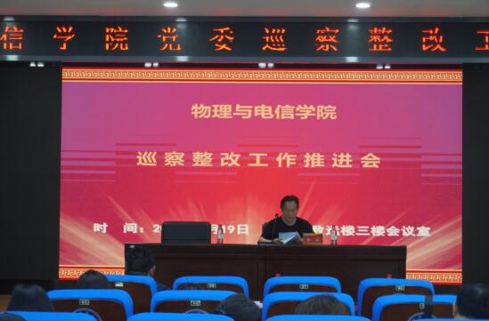 4月19日下午,物电学院在致远楼三楼会议室召开落实学校党委第一巡察组反馈意见整改工作推进会。院党委书记杜杰主持会议并讲话,全体教职工参加会议。